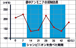 入院中のお年寄り8人はシャンピニオンを食べて、便の悪臭成分アンモニアやインドールを測ったところ、シャンピニオンを食べている間は、顕著に低下しました。止めると上昇する便臭の強い人は、シャンピニオンを食べつづける事が大切です。